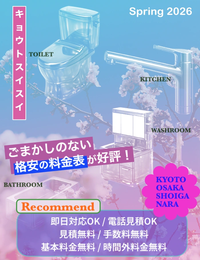 - 地元京都の水道業者で低価格な料金とサービスの質の高さで選ぶならキョウトスイスイにまずご連絡いただくことがおすすめです。
